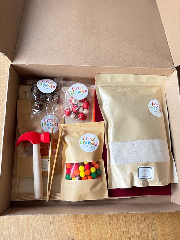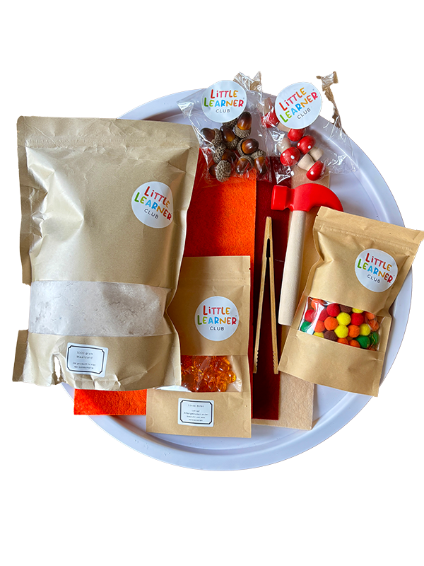 Je ontvangt alle materialen overzichtelijk verpakt, inclusief activiteitenkaarten vol spelideeën. Het bos-avontuur kan direct beginnen! De verpakkingsdoos wordt je extra sensorische bak – duurzaam en handig.